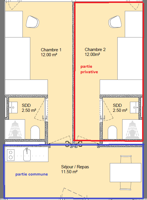 Plan appartement ( 2 chambres)*ne pas tenir compte du code couleur sur l'image